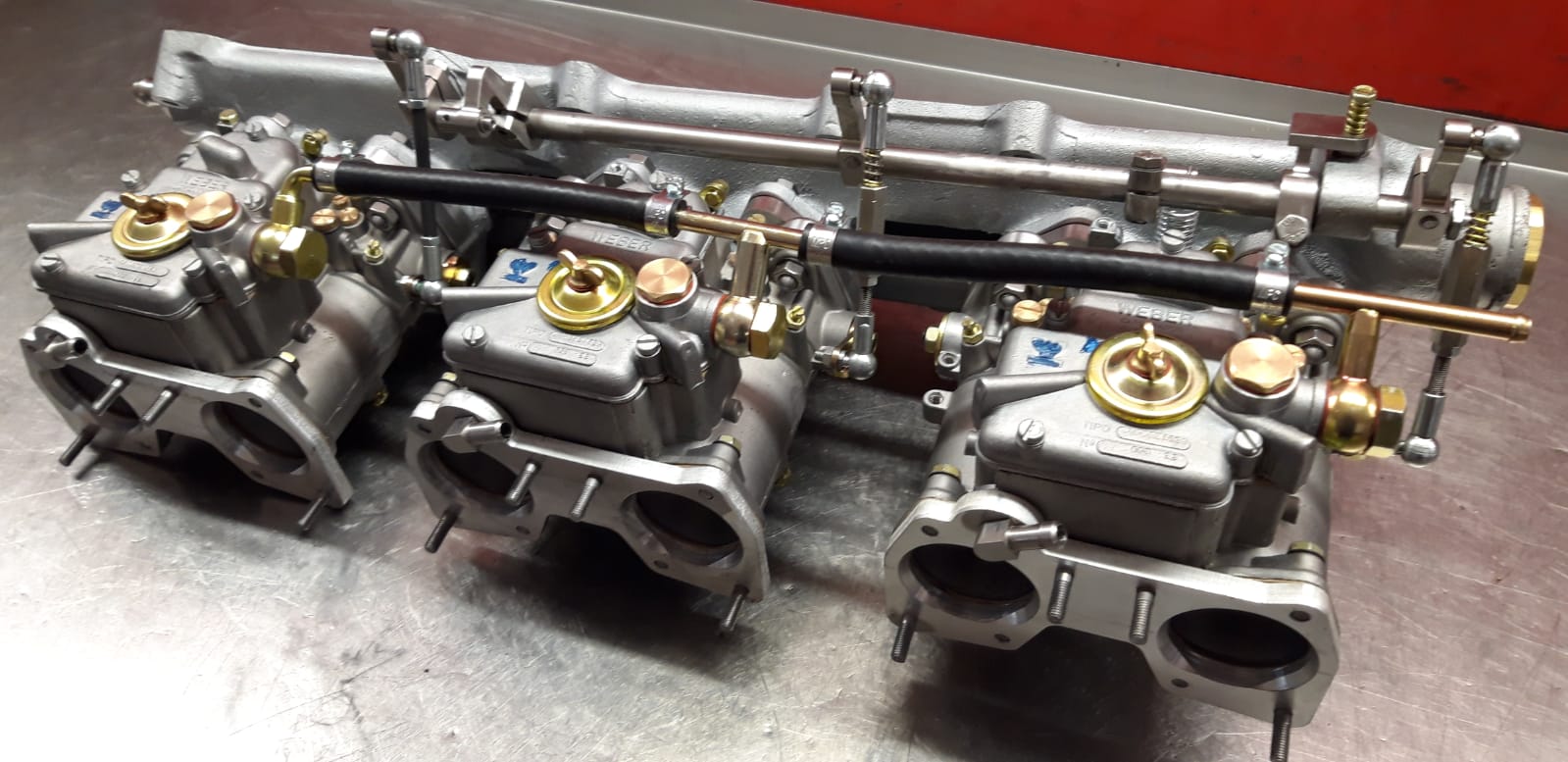 Le collecteur d'admission est modifié en conduit droit, il reçoit ensuite 3 carburateurs WEBER